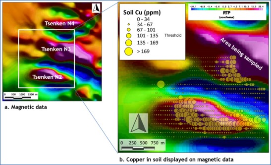 Figure 1. a. Gridded magnetic data (Reduction to the Pole) showing the Tsenken N2, N3 and N4 geophysical targets and b. Copper values in soil overlain on the magnetic map.