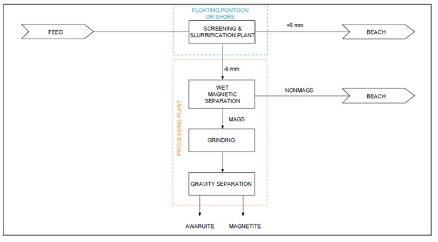 This conceptual study produced a potential process flow diagram for the proposed recovery of awaruite and magnetite using the cutter suction dredger and magnetic separation (Figure 6). At the primary screening & slurrification plant the dredging slurry passes a grizzly and double deck vibrating screen where oversized (>6mm) pebbles are removed and the sands fraction (<6mm) reports to a slurrification bin and subsequent magnetic separation. The pebbles and non-magnetic sand are re-distributed to restore the original beach.